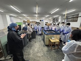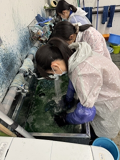 あおもり藍活動報告 あおもり藍を使った染色体験を行いました。 12月12日(金)、総合的な探究の時間の一環として、本校の生徒8名が、あおもり藍産業株式会社を訪れ、藍染めの体験を行いました。作業場では、同社の高橋さんや福士さんの指導を受けながら、持参したTシャツやタオル、ひもなどが次第に青く染まっていく様子に、生徒たちから感嘆の声が上がりました。 染色では、生徒たちが今年、自分たちで苗を植え、雑草取りなどの管理を行った畑で収穫された藍も使用されました。染液に3~4回浸しては洗浄する作業を繰り返す中で、それぞれが疑問を持ったり、次に取り組みたいことを考えたりする様子が見られました。また、藍の葉のパウダーを練り込んだパウンドケーキやプリンを調理したチームは、会社の方々に試食していただき、感想やご意見を伺いました。 染色した作品は持ち帰り、再度洗浄した後、陰干しをして完成となります。どのような色合いに仕上がるのか今から楽しみです。 貴重な体験をさせていただきありがとうございました! あおもり藍産業株式会社さんのホームページ |